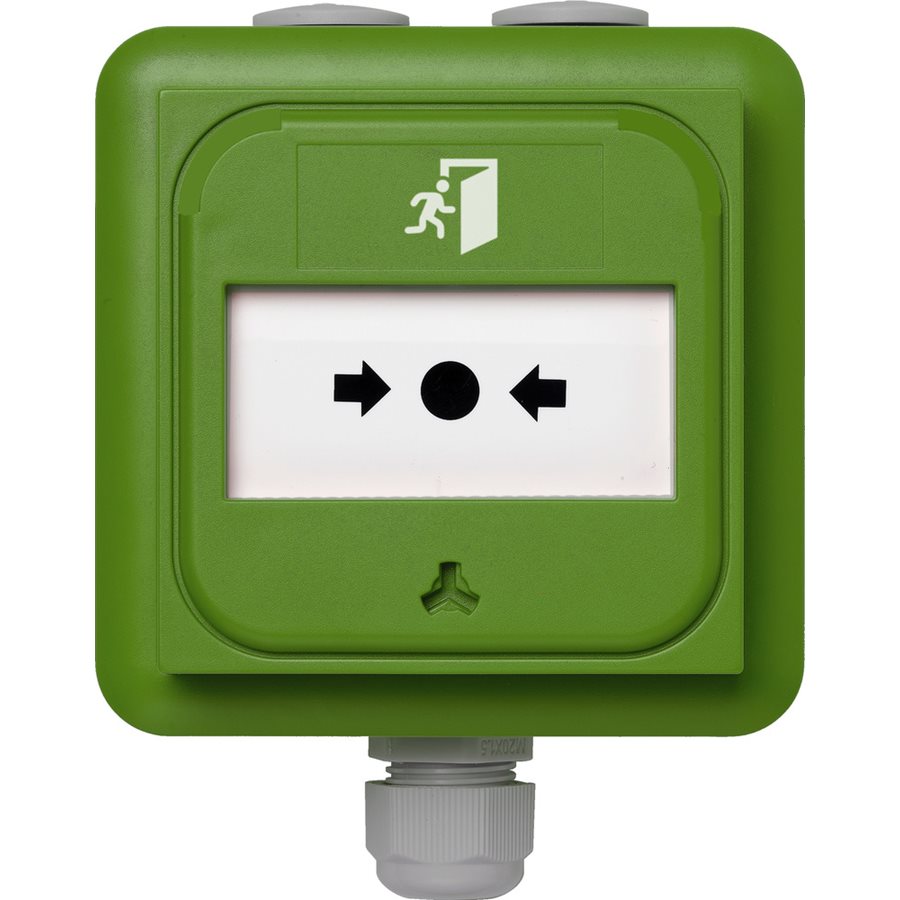 NC-MC-IP-0-G är en grön IP67 Klassad manuell larmknapp för utanpåliggande montage med skyddslock (N-MC-FC) som tillval.