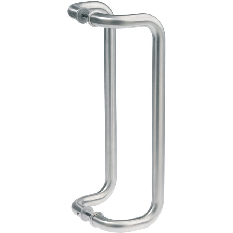 Draghandtag i borstat rostfritt stål avsett för dubbelmontage (PP). Säljes parvis och levereras med skruv för dörrtjocklek upp till 110 mm.