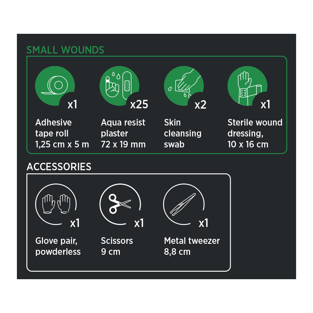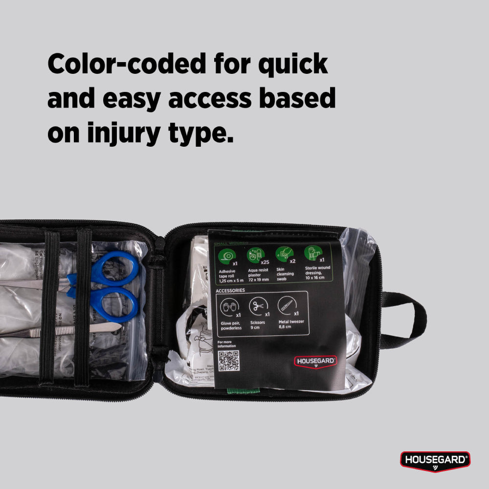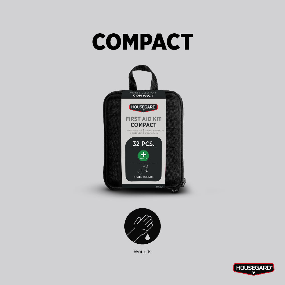 Housegard Compact är din perfekta följeslagare i hemmet, bilen eller på resan. Väskan är liten och lätt, men innehåller ändå det viktigaste för att behandla småsår och mindre skador. Den robusta designen gör den enkel att förvara och ta med, oavsett vart du ska.