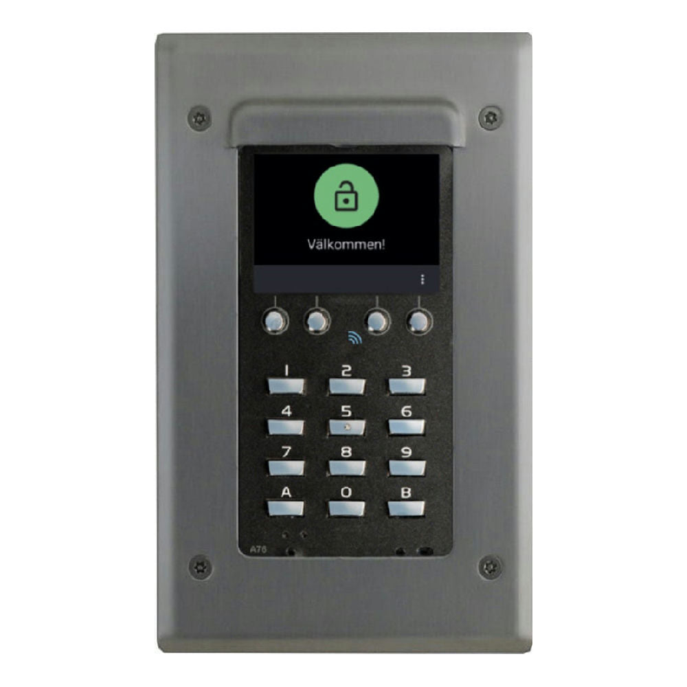 Front i rostfritt stål som fästes med fyra medföljande Sexutorx-skruv (M4X10). Montagekit för Axemas A7x-läsare medföljer.