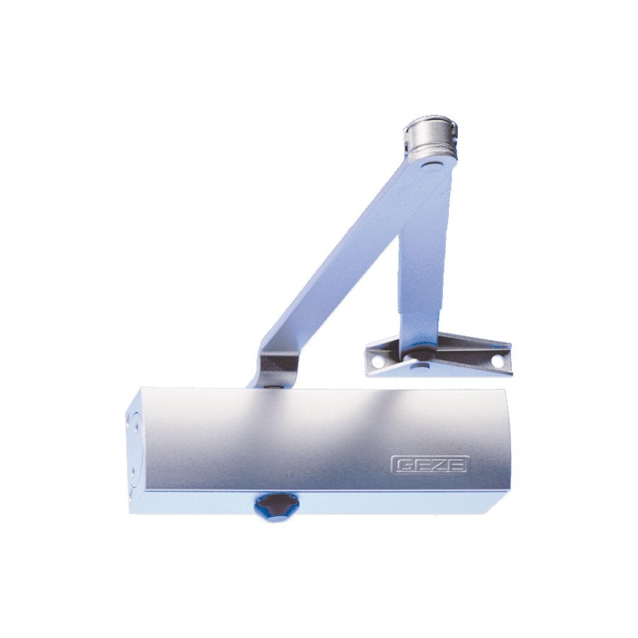 Komplett, silverfärgad dörrstängare från GEZE som består av: