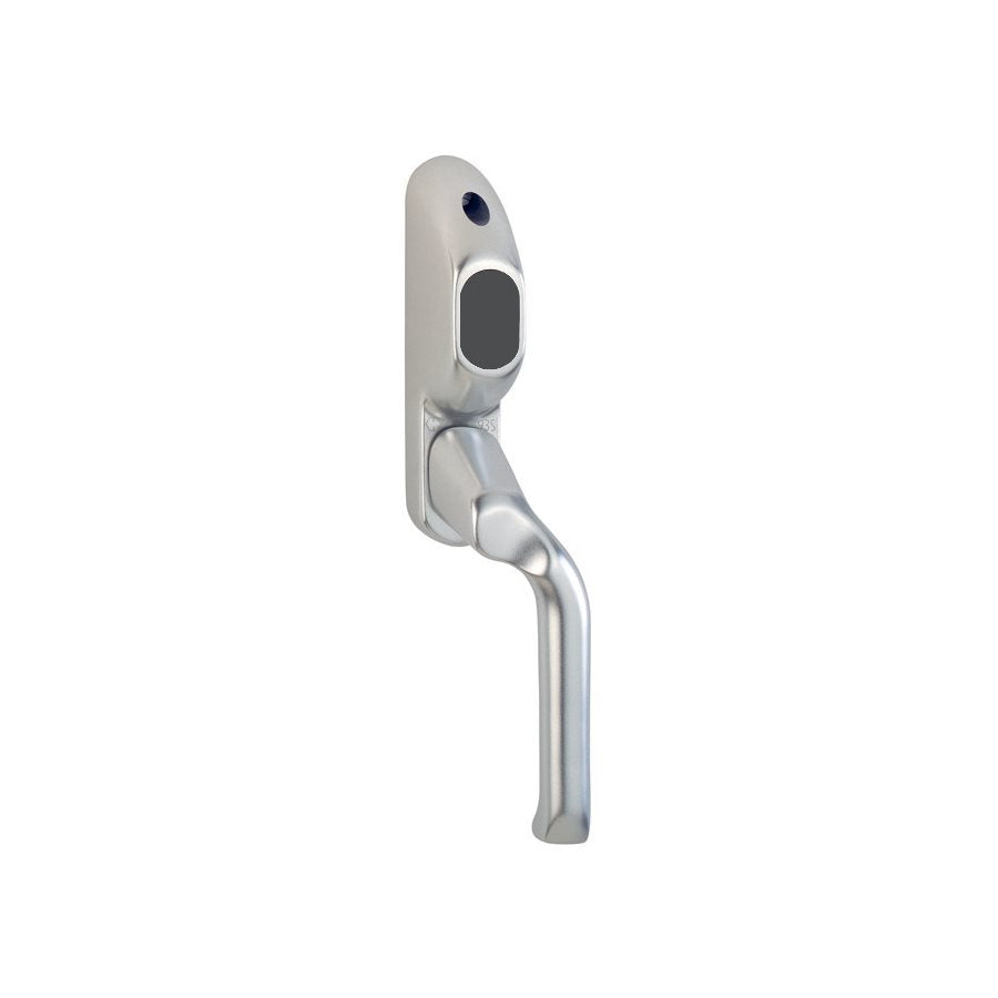 Fönsterhandtag London av aluminium, höger. I kombination med 7-stifts ovalcylinder är det godkänt av Svensk Brand- och Säkerhetscertifiering AB (Standard SS3620, Klass B). Handtagssprint: 53×8 mm. Uppfyller krav på nickelavsättning – allergigodkänt.Specifikationer