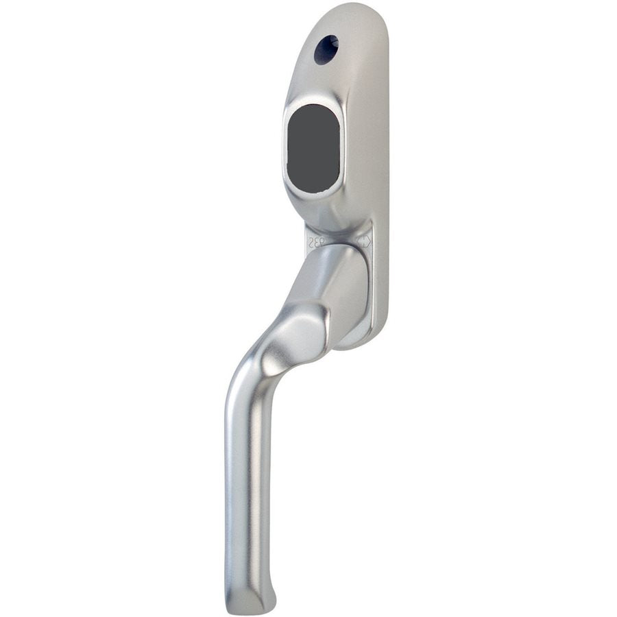 Fönsterhandtag London av aluminium, vänster. I kombination med 7-stifts ovalcylinder är det godkänt av Svensk Brand- och Säkerhetscertifiering AB (Standard SS3620, Klass B). Handtagssprint: 53×8 mm. Uppfyller krav på nickelavsättning – allergigodkänt.Specifikationer