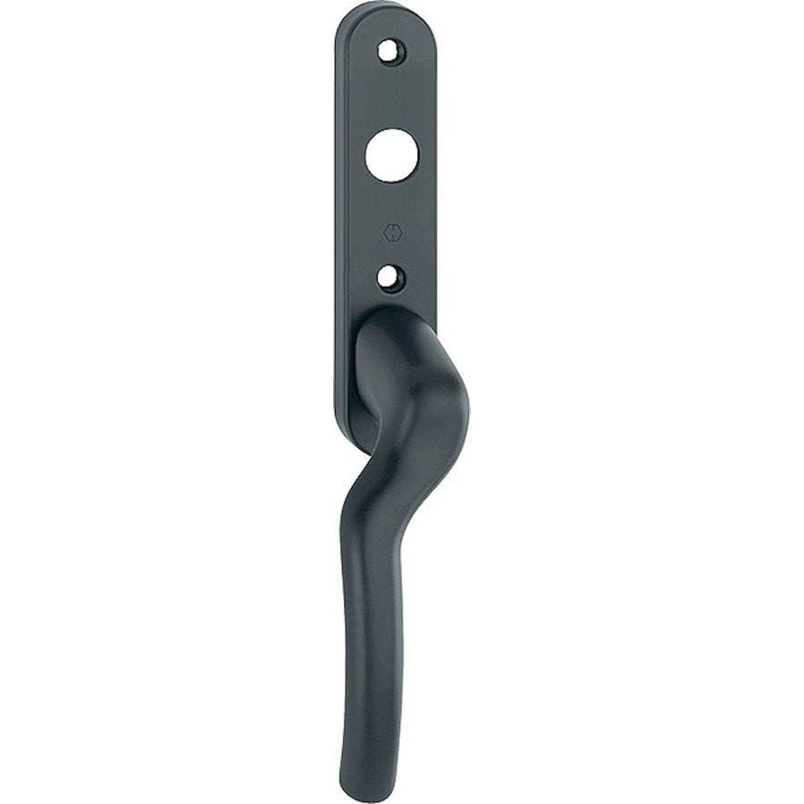 Fönsterdörrshandtag Tokyo av aluminium långskylt, vänster, svart matt, rund rok hål , urtag för 8 mm sprint. Lös sprint medföljer. Uppfyller krav på nickelallergi - godkänt för allergiker.