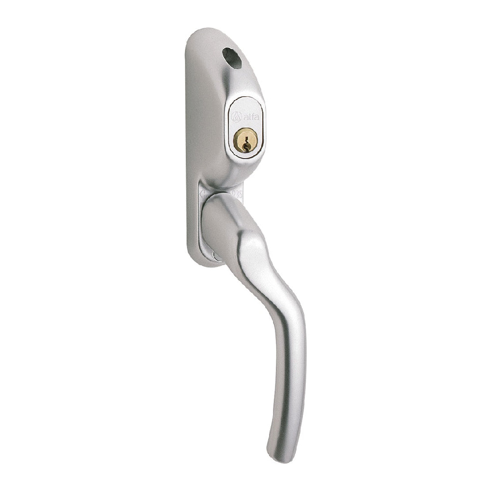 Fönsterhandtag av Aluminium Rostfri nyans F9. I komination med 7-stifts ovalcylinder är det godkänt av Svenska Brand och Säkerhetscertifiering AB, standard SS3620 Klass B. Höger Handtagssprint: 8 x 53 mm. Aluminium är miljö och allergivänligt, återvinningsbart och har grön bedömning hos Byggvarubedömningen.
