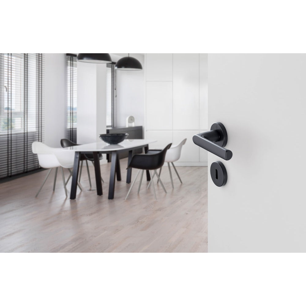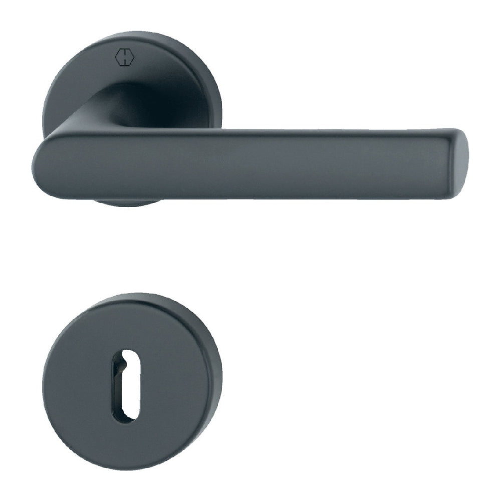 HOPPE handtag Hamburg, aluminium mattsvart F9714 pulverlackerad . Kvick-i-sprint. För innerdörr med Nyckelskylt. Med sin unika fastsättning Kvick-i-Sprint blir montaget stabilare och behöver inte heller återskruvas efter montaget. Dubbelverkande returfjäder. Handtaget är nickelfritt och orsakar därför inte nickelallergi. Dörrtjocklek 37-42 mm, 10 års funktionsgaranti.