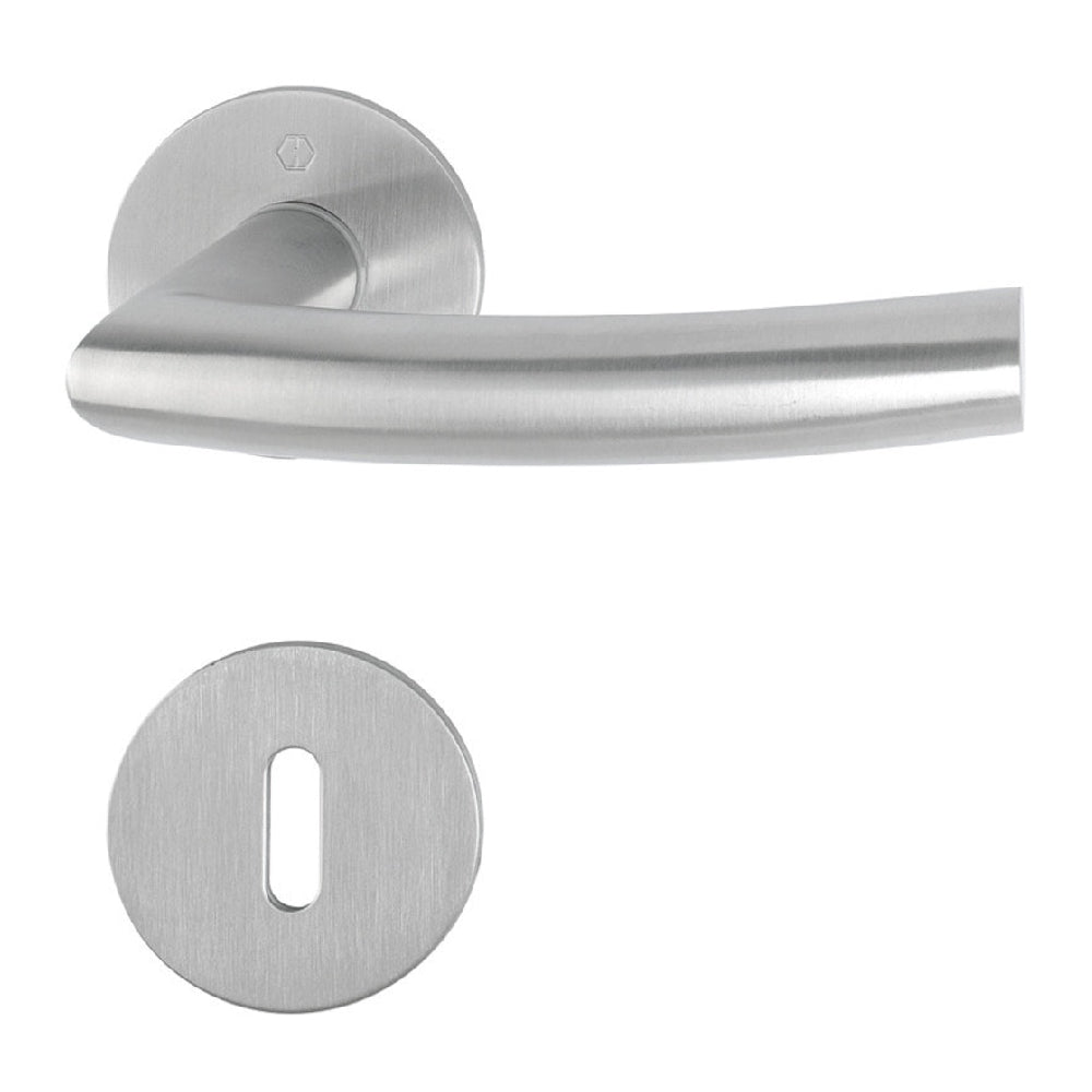 HOPPE-handtagsset i rostfritt för innerdörr, serie Trondheim. Avsedd för innerdörrslåskistor typ 2014. Handtagsrosett med genomgående styrtappar, lös returfjäder, montering utan skruv. Separat dörrhandtag med fastsättning enligt principen HOPPE Kvick-i-Sprint plus. Provade enligt DIN EN 1906.