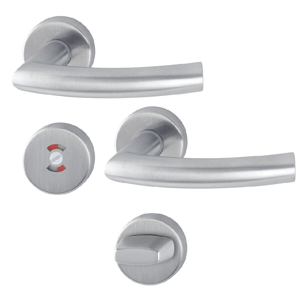 Hoppes innerdörrshandtag Trondheim, serie Duraplus, i Rostfritt F69, för WC. Med sin unika fastsättning med Kvick-i-Sprint blir montaget stabilare och behöver inte heller återskruvas efter montaget. Dubbelverkande returfjäder. Dörrtjocklek 37-42mm, 10 års funktionsgaranti. SB pack
