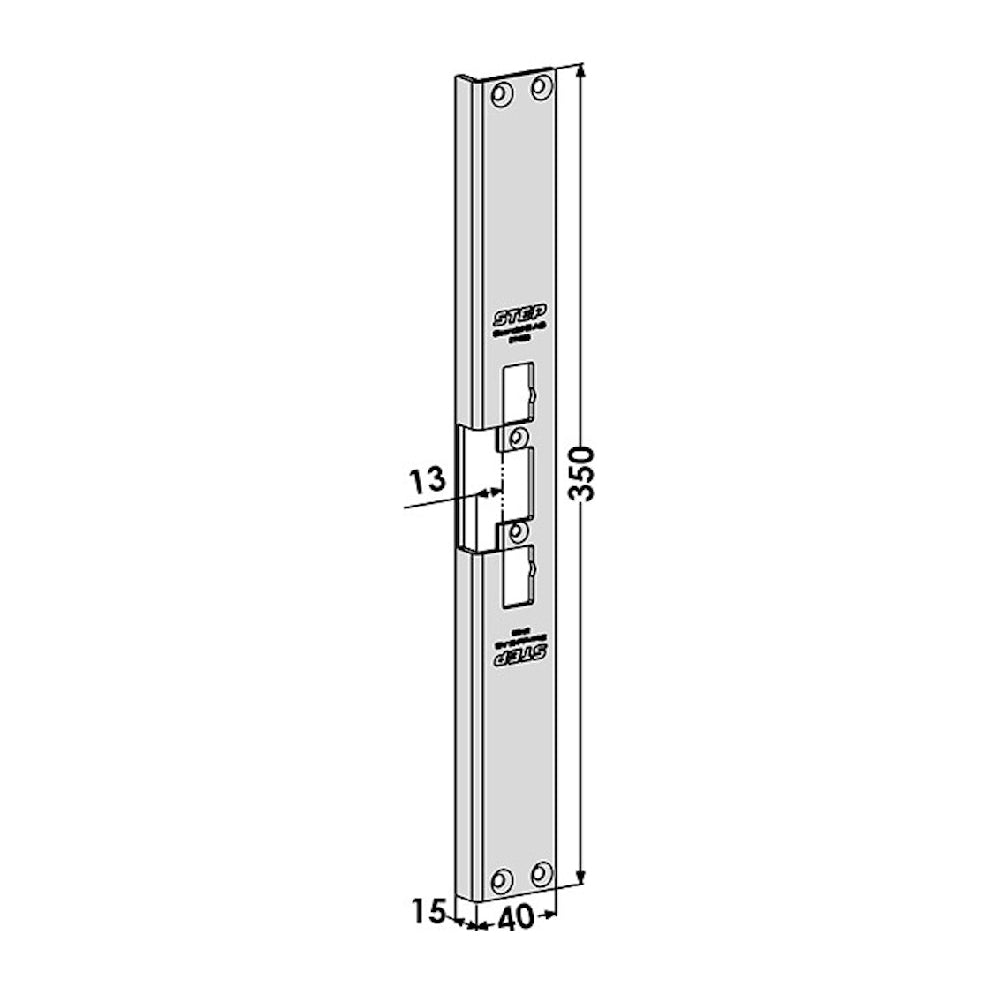 Monteringsstolpe i rostfritt stål för STEP 40/90/48/98. Anpassad för skadad dörrkarm eller där urtag för annat elslutbleck är gjort. För enkel- och dubbelfallås Modul eller Connect.