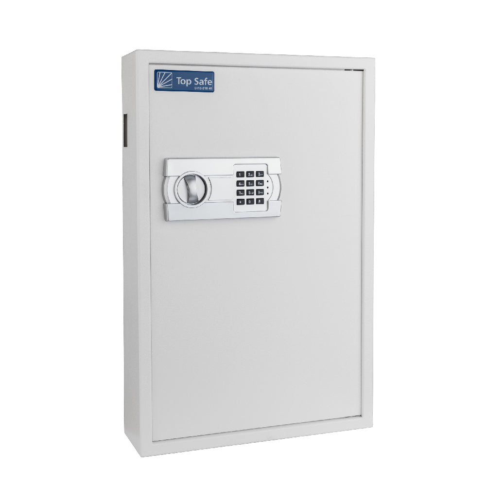 Top 120 är ett oklassat nyckelskåp med 120 st nyckelkorkar. Skåpet har ett programmerbart elektroniskt kodlås med 3-8 siffror, skåpet har även nödöppningslås med två nycklar. På sidan av skåpet finns ett deponeringsinkast för nycklarna. Skåpet är förberett för fastbultning i vägg. Bultar medföljer.- Färgkod: Vit- Standardutrustning: 120 st nyckelkrokar, deponeringsinkast och förankringsinsats- Lås: Elektroniskt kodlås och 2st nödöppningsnycklar- Mått (utvändigt): (hxbxd) 680x420x130 mm- Vikt: 15 kg- Batteri: 4 st AA, ingår