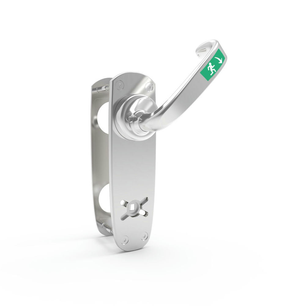 SAFETRON 796 för vänsterhängda dörrar. Nödbeslaget är avsedd för slagdörrar av modulutförande i utrymningsvägar där inga särskilda krav på panikutrymning föreligger. SAFETRON 796 är godkänd som nödbeslag ihop med SAFETRON 6600. Låset öppnas med ett handgrepp, vilket innebär en säker utrymning.