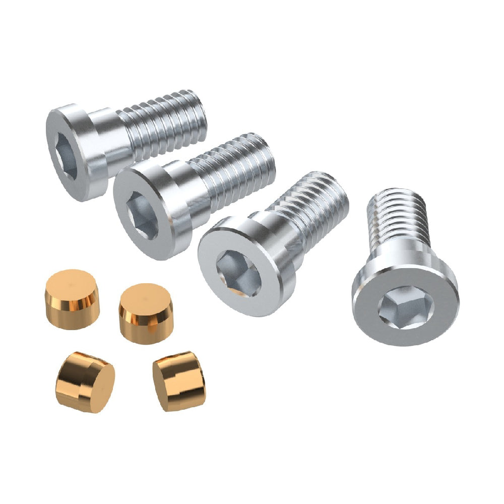 Set med fyra reservskruvar i förzinkat stål och täckpluggar i solid mässing för säker och snygg montering av Låslåda 80 (fd Aluseal).
