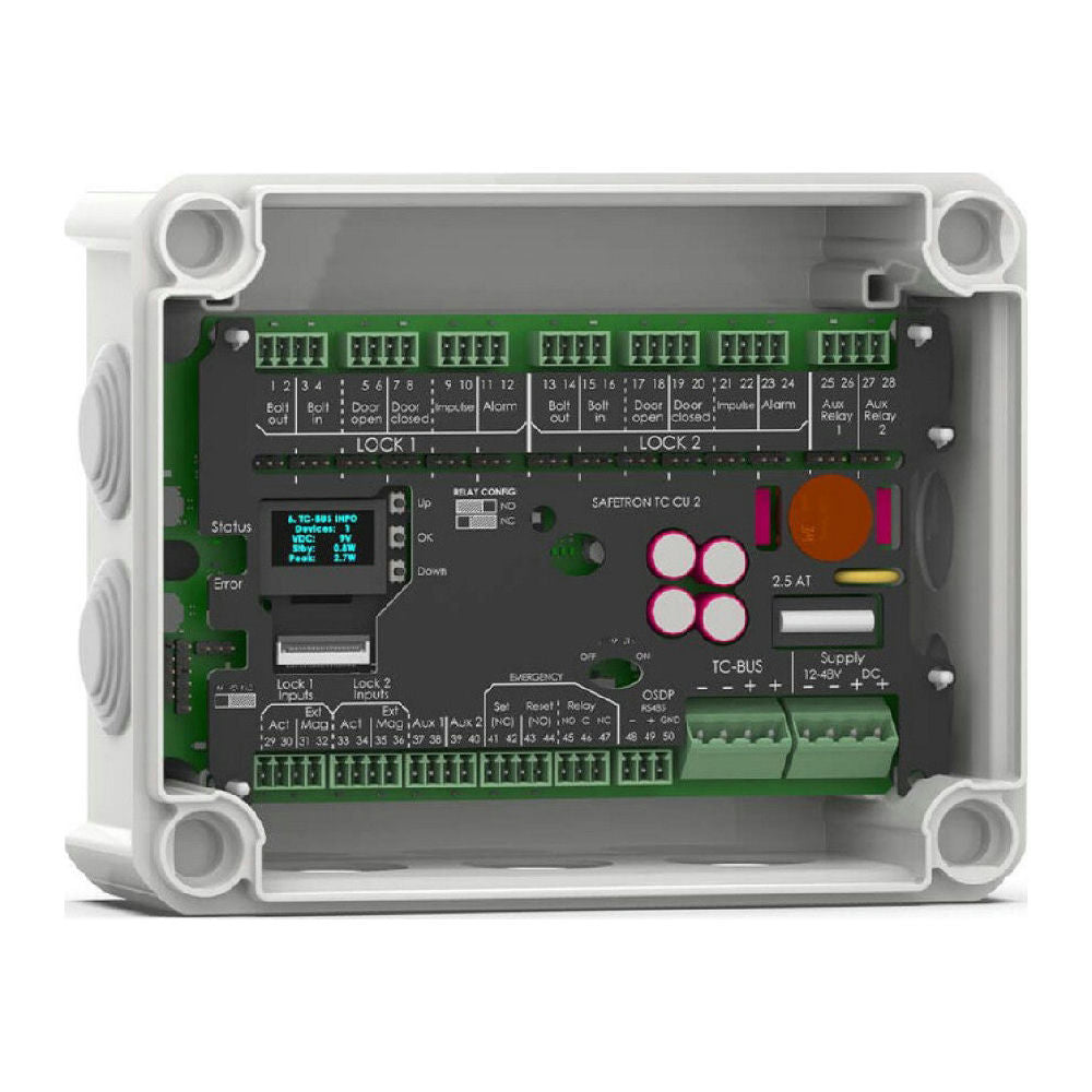 SAFETRON CU2 kommunicerar med 128-bitars kryptering och tillåter kabellängder upp till 100 meter mellan låshus och styrenhet. Detta öppnar för nya möjligheter att installera styrenheter i skyddade miljöer såsom elcentraler eller serverrum.
