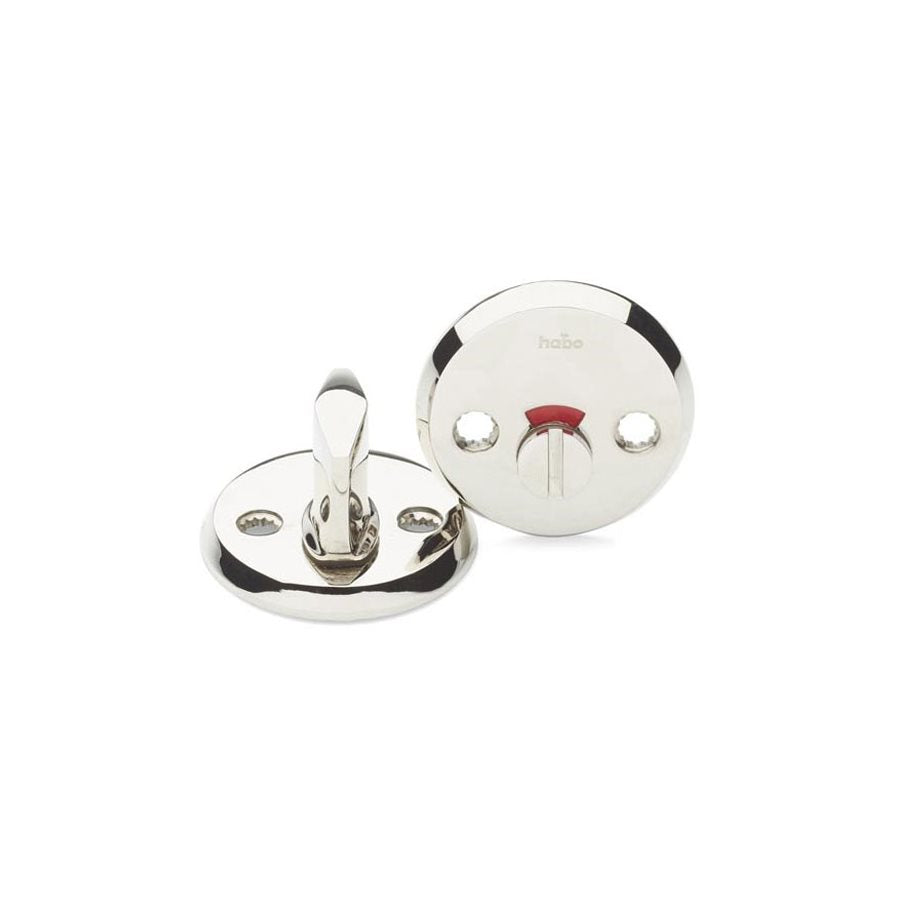 WC-beslag av förnicklad mässing. Levereras med skruv för genomgående fastsättning. Avsett för modullås typ 6565. Passar till dörrtjocklek 38-65 mm.