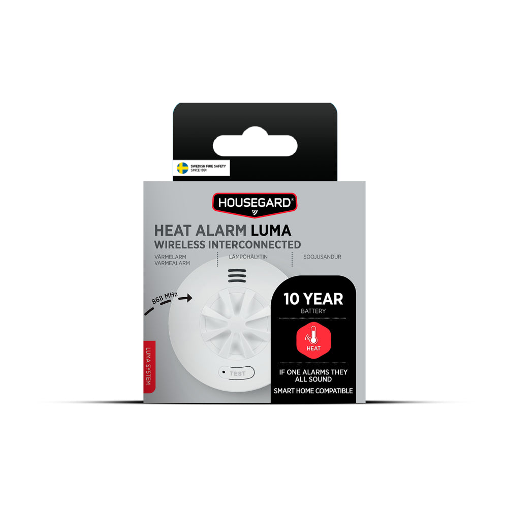 LUMA värmevarnare varnar för höga temperaturer (detekterar temperaturer mellan 54- 65 °) och är ett komplement till brandvarnare. Lämplig för kök, tvättstuga, vind, garage, där det är kallt, fuktigt eller dammigt. Genom Luma Hub (köps separat) gör du din varnare smart och kan t.ex få notiser i din telefon.