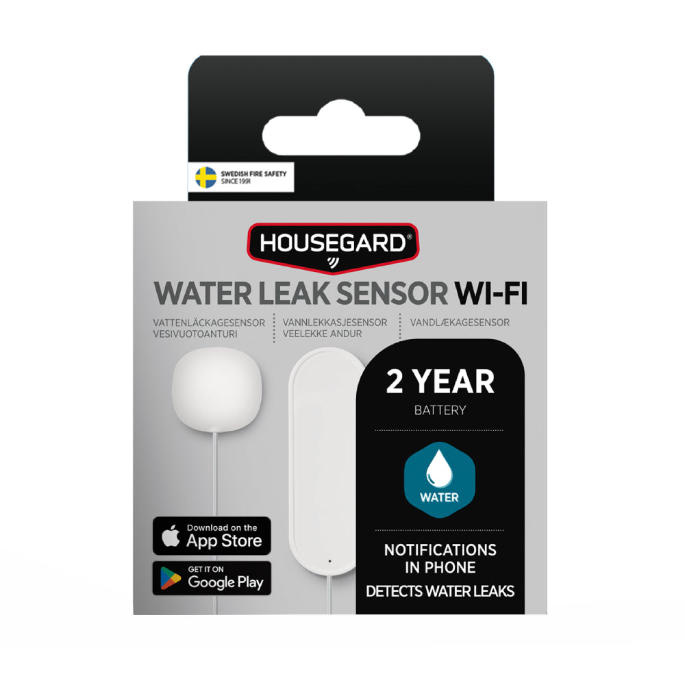 Housegard wifi vattenläckagesensor WA 202 ger dig en snabb och effektiv varning vid läckande vattenrör, diskmaskiner och tvättmaskiner. Vid upptäckt av vattenläckor, exempelvis vid diskmaskin, tvättmaskin eller rör, skickas omedelbart en notis till din smartphone. Den lilla sensorn är ansluten till detektorenheten via en 1,3 m lång kabel, vilket gör det enkelt att placera den även i trånga eller svåråtkomliga utrymmen. Med hjälp av appen, Smart Life – Smart Living, som finns tillgänglig för nedladdning både i App Store och Google Play, kan du enkelt installera och konfigurera din enhet.